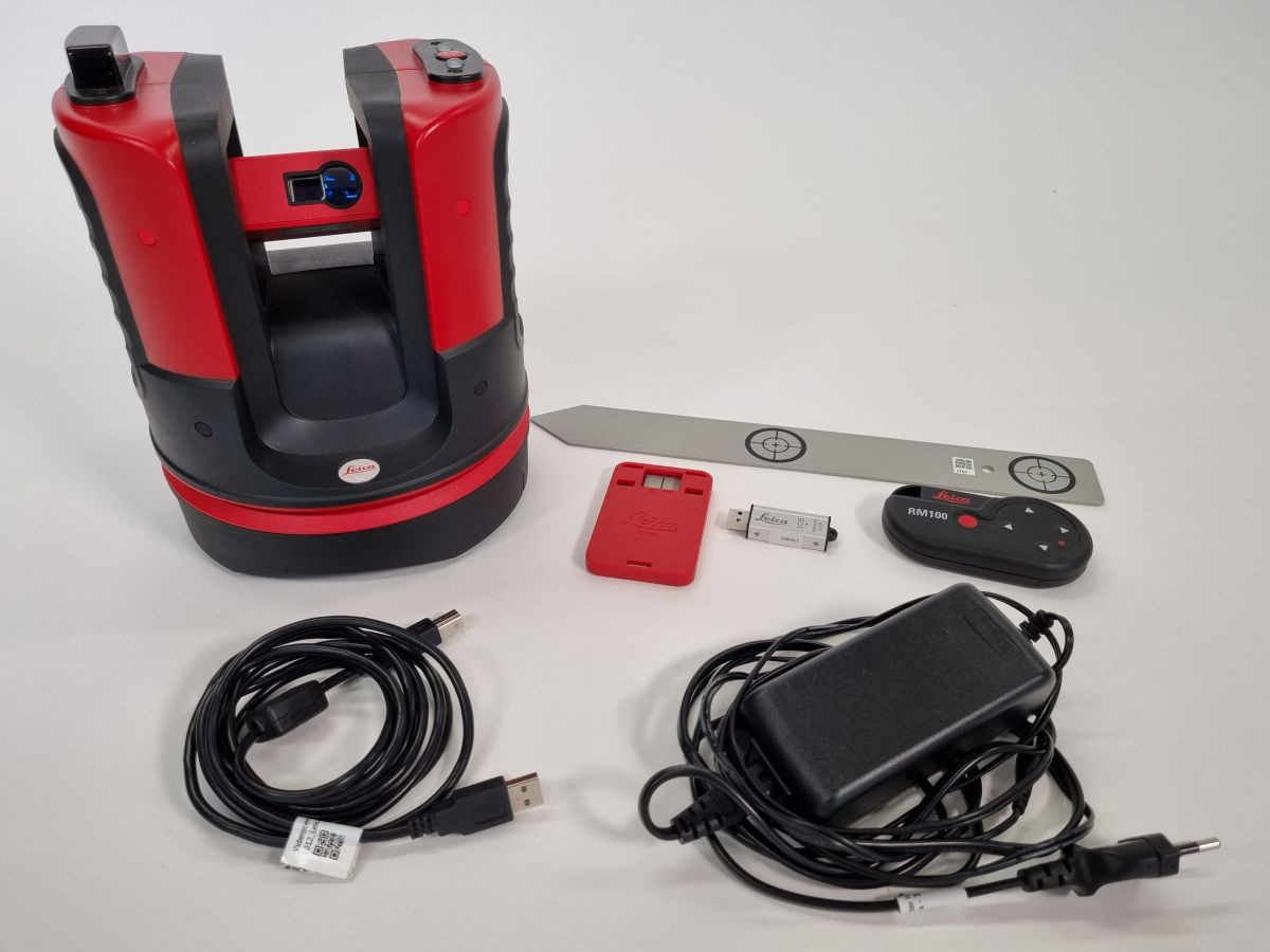 Leveres med RM100 fjernbetjening, USB-stik, selvklæbende sigtemærker, lineal til offset-punkter, strømforsyning, USB-kabler, WLAN-stik, Leica 3D Disto software til windows® og kuffert.