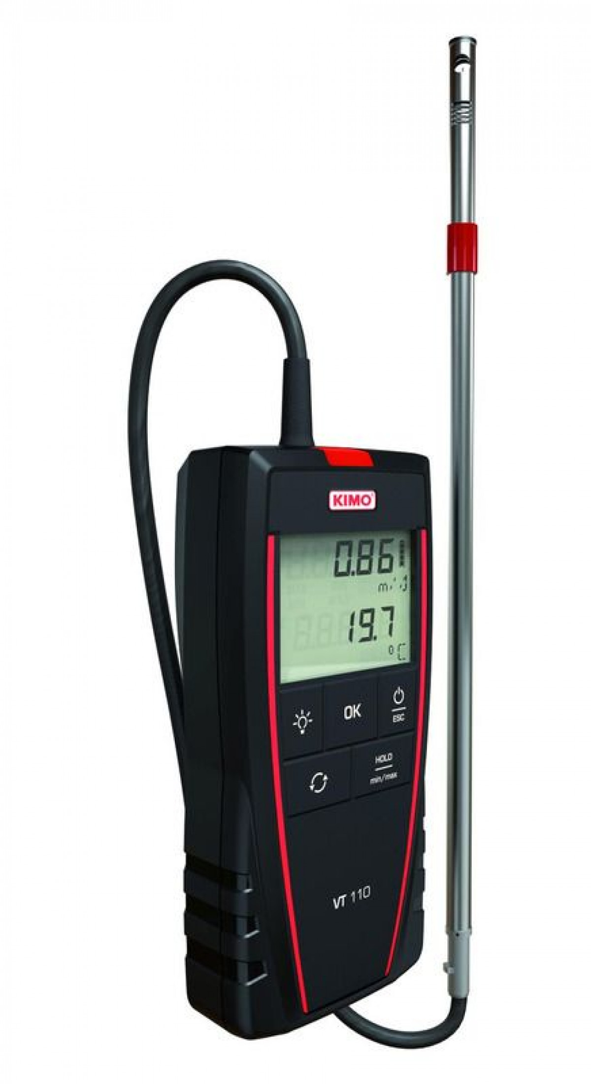 KIMO VT110 er et nyt varmetrådsanemometer til måling af både lufthastighed og flow direkte i kanaler, eller måling af flow med tragt (tragt bestilles separat).